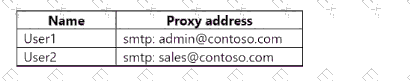 From Active Directory Users and Computers, you update the proxyAddresses attribute for eachuser as shown in the following table.