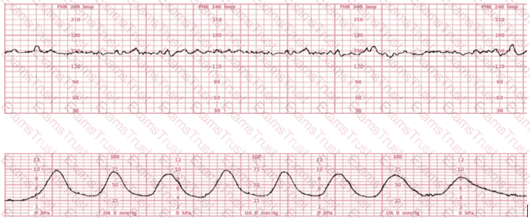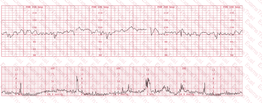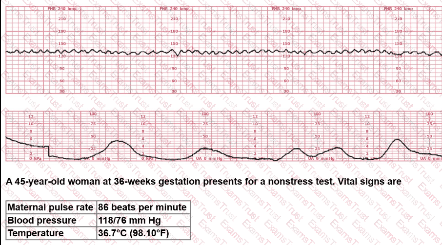 A 45-year-old woman at 36-weeks gestation presents for a nonstress test. Vital signs are: