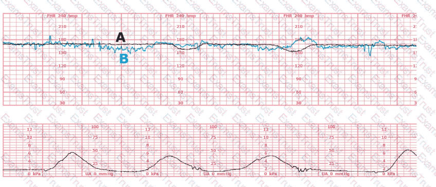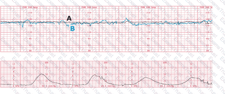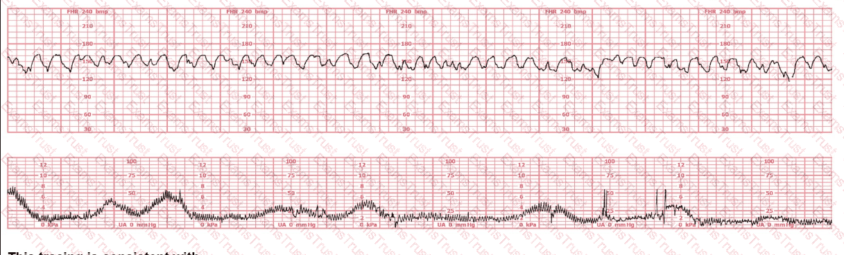 The black pattern represents the heart rate pattern for Baby A. The blue pattern represents the heart rate pattern for Baby B. A possible etiology of the baseline fetal heart rate of Baby A is: