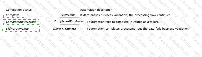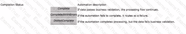 The business requirements states that the login automation creates a Success or Failed response when attempting to log in to the finance application. If a failure occurs, the automation should pass a message code with the Message Manifest before exiting the automation.