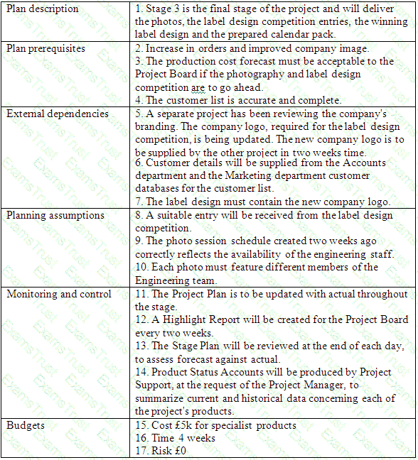 Using the Project Scenario answer the following question. The Plan for stage 3 has been approved and work has commenced.