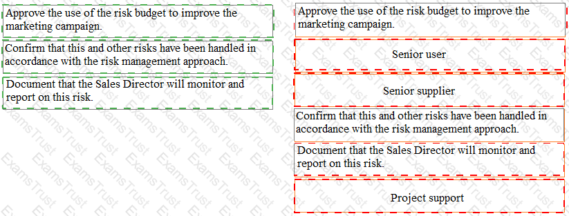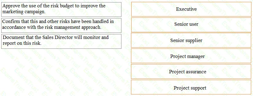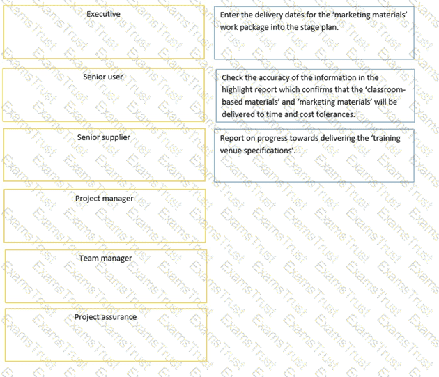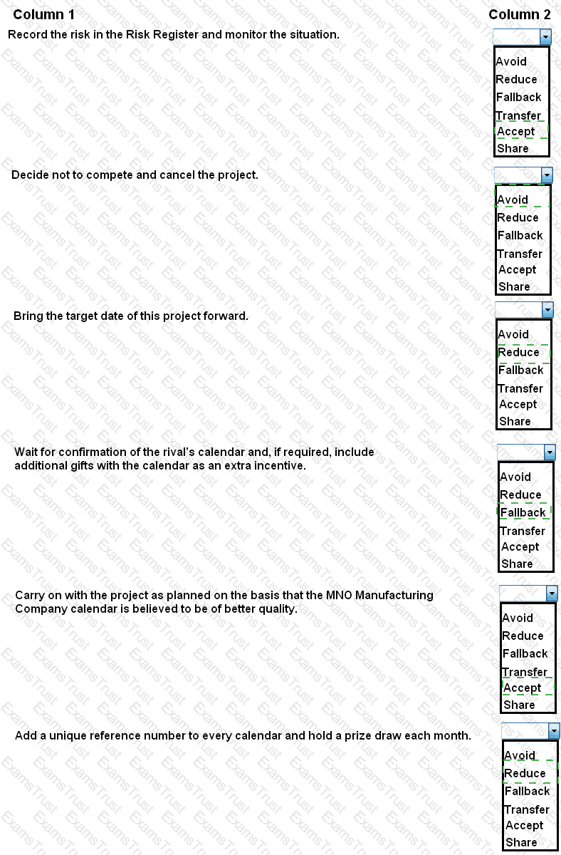 Column 1 contains a number of risk responses identified by the Project Manager following an assessment of this risk. Column 2 contains a list of threat response types. For each risk response in Column 1, select from Column 2 the type of response it represents. Each option from Column 2 can be used once, more than once or not at all.