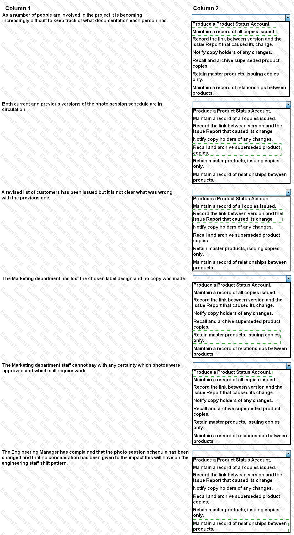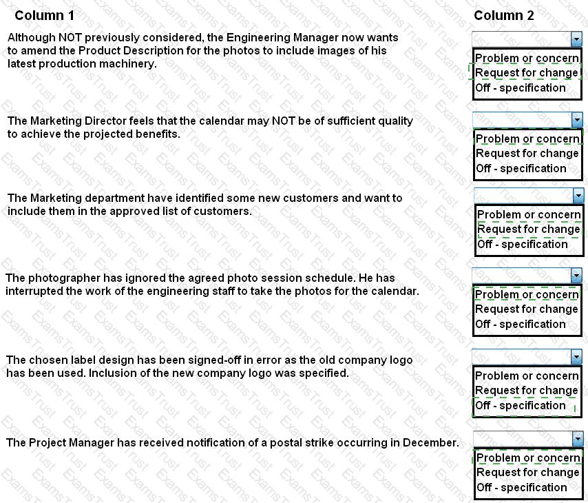 Column 1 contains a number of issues for this project. Select from Column 2 the appropriate category for each issue. Each selection from Column 2 can be used once, more than once or not at all.