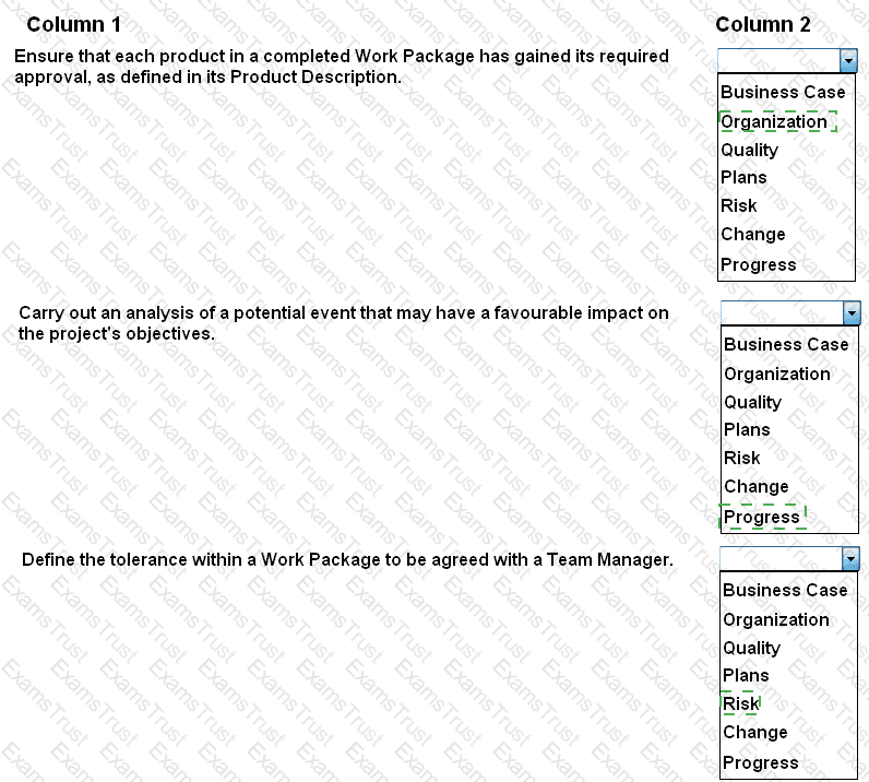 Column 1 is a list of actions that occur during the Controlling a Stage process. For each action in Column 1, select from Column 2 the PRINCE2 theme that is being applied. Each selection from Column 2 can be used once, more than once or not at all.