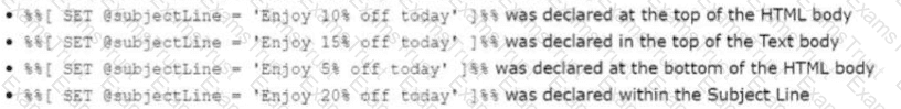 A developer created an email using the fasubjectLine variable as the subject line. Due to revisions, the developer declared <>subjectLine in multiple locations throughout the email, including: