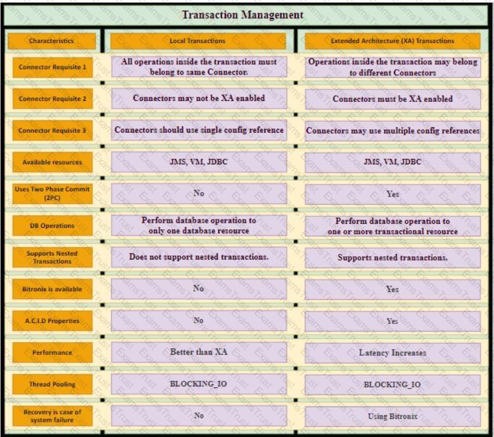 A Mule application currently writes to two separate SQL Server database instances across the internet using a single XA transaction. It is 58. proposed to split this one transaction into two separate non-XA transactions with no other changes to the Mule application.