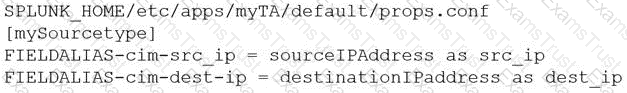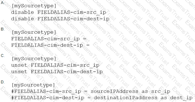 An add-on has configured field aliases for source IP address and destination IP address fields. A specific user prefers not to have those fields present in their user context. Based on the defaultprops.confbelow, whichSPLUNK_HOME/etc/users/buttercup/myTA/local/props.confstanza can be added to the user’s local context to disable the field aliases?