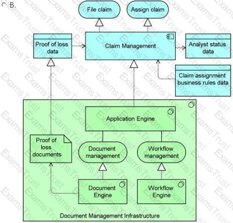 The claim management application component is critical to ArchiSurance business operations. It is hosted by the application engine, and launches whenever an individual files a new claim. The claim management component requires different documents to demonstrate proof of loss depending on the type of claim filed, the type of insurance that is in force, and various other circumstances. When the correct documents are filed and verified by an intake operator, proof of loss is complete, and the claim management component assigns the claim to a claim analyst by reading and updating analyst status data and applying business rules stored as data.