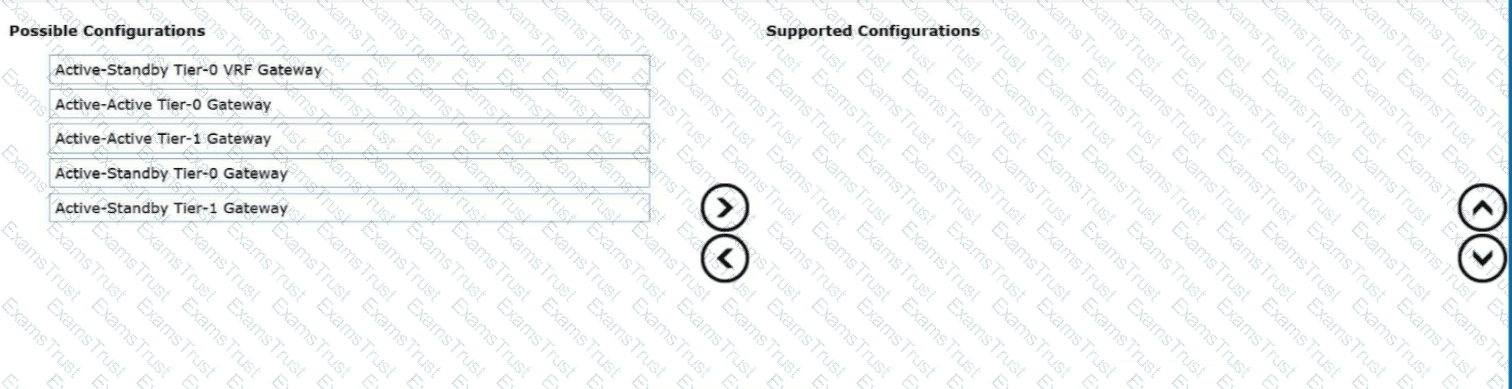 An administrator is responsible for the management of a VMware Cloud Foundation (VCF) Fleet that consists of two VCF instances that are located in different physical locations. The administrator has been tasked with configuring a VPN between the two locations and has been tasked with identifying the two supported NSX Gateway configurations for an IPSec VPN. Drag and drop two items from the list of Possible Configurations into the list of Supported Configurations in any order.(Choose two.)